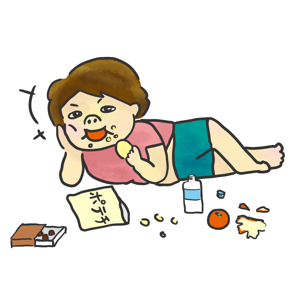 寝転がってお菓子を食べる人